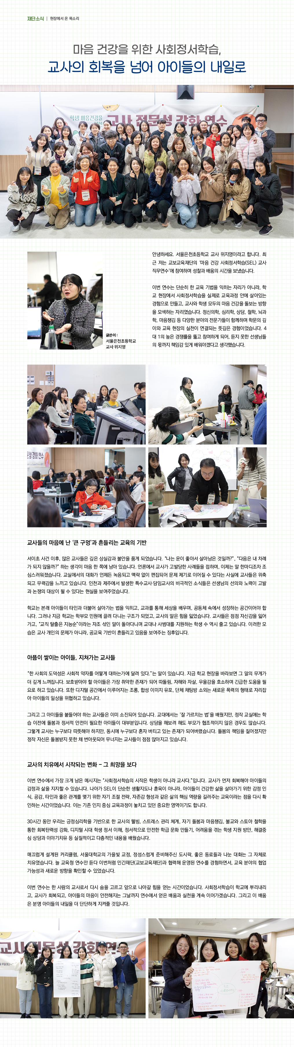 ¾È³çÇϼ¼¿ä. ¼¿ïÀºÃµÃʵîÇб³ ±³»ç À§Áö¿µÀ̶ó°í ÇÕ´Ï´Ù. ÃÖ±Ù Àú´Â ±³º¸±³À°Àç´ÜÀÇ ¡®¸¶À½ °Ç° »çȸÁ¤¼ÇнÀ(SEL) ±³»ç Á÷¹«¿¬¼ö¡¯¿¡ Âü¿©ÇÏ¸ç ¼ºÂû°ú ¹è¿òÀÇ ½Ã°£À» º¸³Â½À´Ï´Ù.