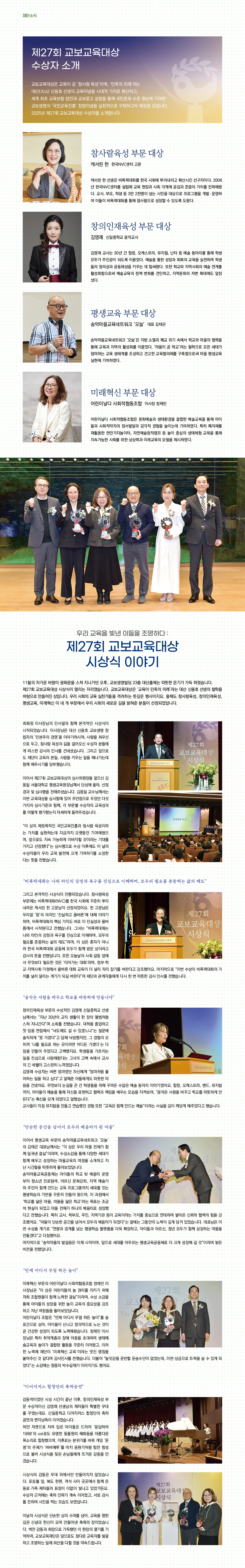 11¿ùÀÇ Â÷°¡¿î ¹Ù¶÷ÀÌ ±¤È¹®À» ½ºÃÄ Áö³ª°¡´ø ¿ÀÈÄ, ±³º¸»ý¸íºôµù 23Ãþ ´ë»êȦ¿¡´Â µû¶æÇÑ ¿Â±â°¡ °¡µæ ÆÛÁ³½À´Ï´Ù. Á¦27ȸ ±³º¸±³À°´ë»ó ½Ã»ó½ÄÀÌ ¿¸®´Â ÀÚ¸®¿´½À´Ï´Ù. ±³º¸±³À°´ë»óÀº ¡®±³À°ÀÌ ¹ÎÁ·ÀÇ ¹Ì·¡¡¯¶ó´Â ´ë»ê ½Å¿ëÈ£ ¼±»ýÀÇ Ã¶ÇÐÀ» ¹ÙÅÁÀ¸·Î ¸¸µé¾îÁø »óÀÔ´Ï´Ù.