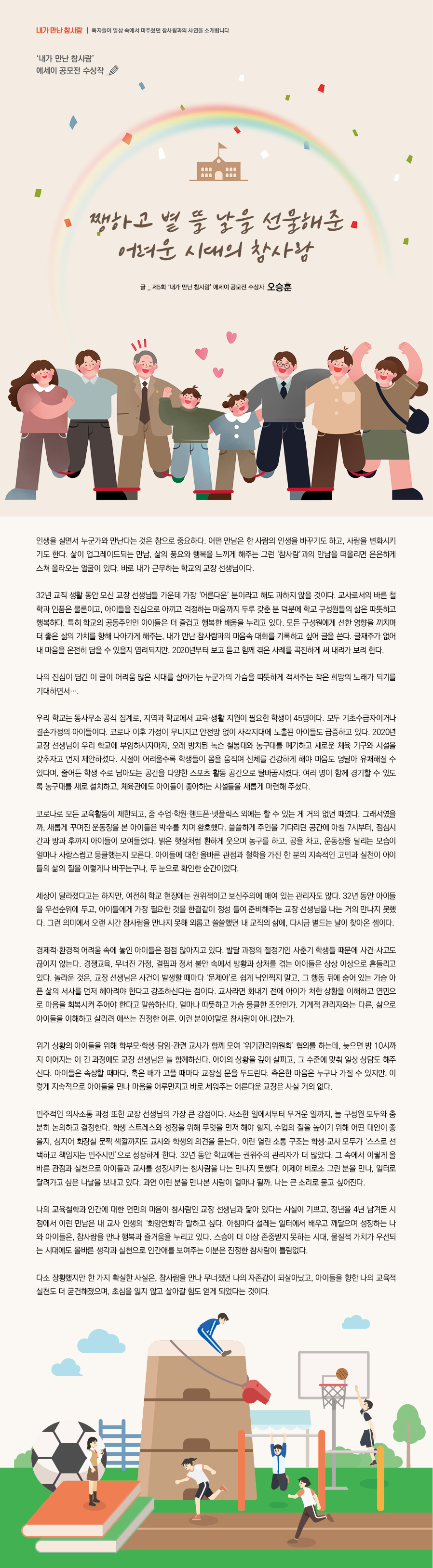 Äڷγª·Î ¸ðµç ±³À°È°µ¿ÀÌ Á¦Çѵǰí, ÁÜ ¼ö¾÷¡¤Çпø¡¤ÇÚµåÆù¡¤³ÝÇø¯½º ¿Ü¿¡´Â ÇÒ ¼ö ÀÖ´Â °Ô °ÅÀÇ ¾ø´ø ¶§¿´´Ù. ±×·¡¼¿´À»±î, »õ·Ó°Ô ²Ù¸çÁø ¿îµ¿ÀåÀ» º» ¾ÆÀ̵éÀº ¹Ú¼ö¸¦ Ä¡¸ç ȯȣÇß´Ù. ¾µ¾µÇÏ°Ô ÁÖÀÎÀ» ±â´Ù¸®´ø °ø°£¿¡ ¾ÆÄ§ 7½ÃºÎÅÍ, Á¡½É½Ã°£°ú ¹æ°ú ÈıîÁö ¾ÆÀ̵éÀÌ ¸ð¿©µé¾ú´Ù. ¹àÀº ÇÞ»ìó·³ ȯÇÏ°Ô ¿ôÀ¸¸ç ³ó±¸¸¦ Çϰí, °øÀ» Â÷°í, ¿îµ¿ÀåÀ» ´Þ¸®´Â ¸ð½ÀÀÌ ¾ó¸¶³ª »ç¶û½º·´°í ¹¶Å¬Çß´ÂÁö ¸ð¸¥´Ù. ¾ÆÀ̵鿡 ´ëÇÑ ¿Ã¹Ù¸¥ °üÁ¡°ú öÇÐÀ» °¡Áø ÇÑ ºÐÀÇ Áö¼ÓÀûÀÎ °í¹Î°ú ½ÇõÀÌ ¾ÆÀ̵éÀÇ »îÀÇ ÁúÀ» ÀÌ·¸°Ô³ª ¹Ù²Ù´Â±¸³ª, µÎ ´«À¸·Î È®ÀÎÇÑ ¼ø°£À̾ú´Ù.
