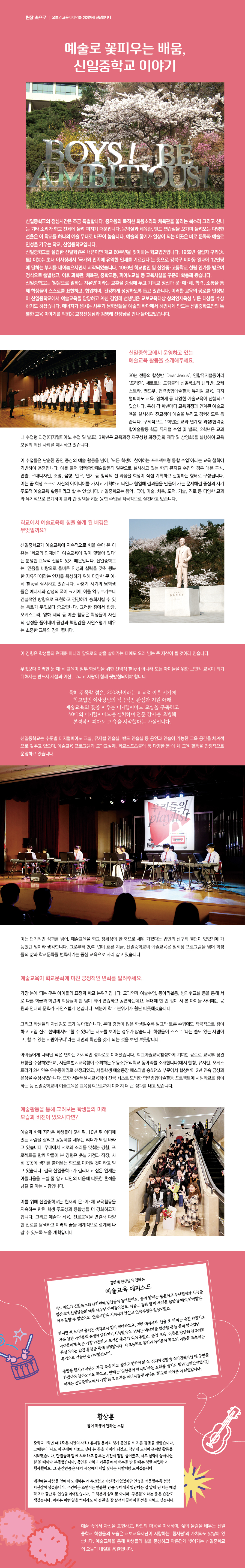 ½ÅÀÏÁßÇб³ÀÇ Á¡½É½Ã°£Àº Á¶±Ý Ưº°ÇÕ´Ï´Ù. ÁßÀúÀ½ÀÇ ¹¬Á÷ÇÑ ÈÀ½¼Ò¸®¿Í üÀ°°üÀ» ¿ï¸®´Â ºÏ¼Ò¸® ±×¸®°í ½Å³ª´Â ±âŸ ¼Ò¸®°¡ Çб³ Àüü¿¡ ¿ï·Á ÆÛÁö±â ¶§¹®ÀÔ´Ï´Ù. À½¾Ç½Ç°ú üÀ°°ü, ¹êµå ¿¬½À½ÇÀ» ¿À°¡¸ç µé·Á¿À´Â ´Ù¾çÇÑ ¼±À²Àº ÀÌ Çб³¸¦ ÇϳªÀÇ ¿¹¼ú ¹«´ë·Î ¹Ù²Ù¾î ³õ½À´Ï´Ù. ¿¹¼úÀÇ Çâ±â°¡ ÀÏ»óÀÌ µÇ´Â À̰÷Àº ¹Ù·Î ¹®È¿Í ¿¹¼ú·Î ÀμºÀ» Ű¿ì´Â Çб³, ½ÅÀÏÁßÇб³ÀÔ´Ï´Ù