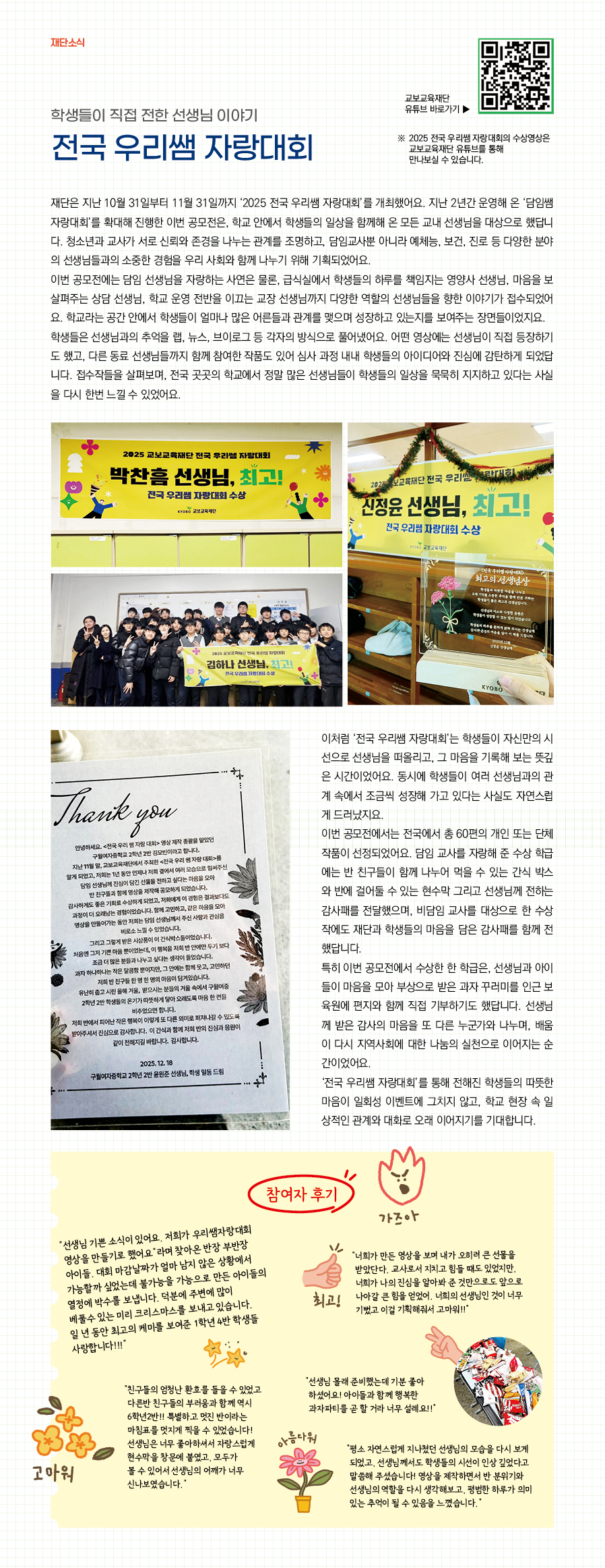 Àç´ÜÀº Áö³ 10¿ù 31ÀϺÎÅÍ 11¿ù 31ÀϱîÁö ¡®2025 Àü±¹ ¿ì¸®½Ü ÀÚ¶û´ëȸ¡¯¸¦ °³ÃÖÇß¾î¿ä. Áö³ 2³â°£ ¿î¿µÇؿ ¡®´ãÀÓ½Ü ÀÚ¶û´ëȸ¡¯¸¦ È®´ëÇØ ÁøÇàÇÑ À̹ø °ø¸ðÀüÀº, Çб³ ¾È¿¡¼ ÇлýµéÀÇ ÀÏ»óÀ» ÇÔ²²ÇØ ¿Â ¸ðµç ±³³» ¼±»ý´ÔÀ» ´ë»óÀ¸·Î Çß´ä´Ï´Ù.
